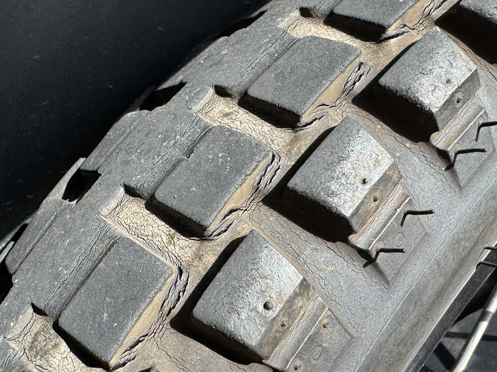 ↑経年によるヒビやタイヤ溝の深さも次回の車検に耐えられるレベルではないでしょう。